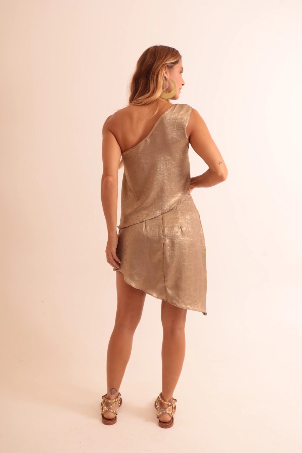 combina o corte assimétrico com um tecido metalizado 100% poliéster, de tecelagem especial, que proporciona um brilho sofisticado e textura única.